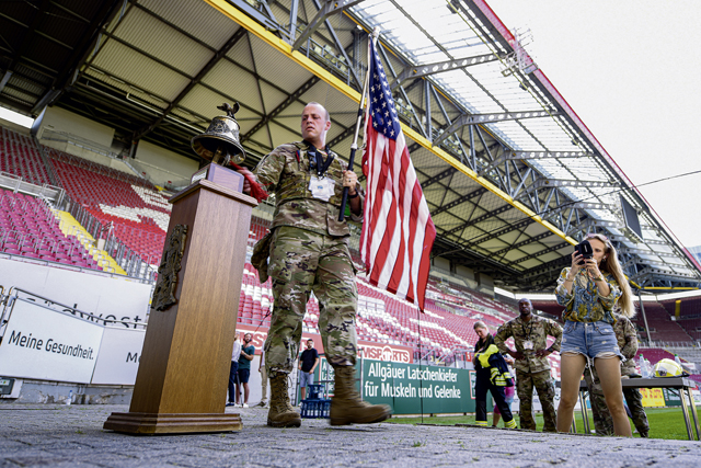 U.S. Air Force Lt. Col. Taylor Branco, 721st Aircraft Maintenance Squadron commander, rings a ceremonial bell, signifying his completion of a 2,071-step memorial ruck march, Kaiserslautern, Sep. 11. The 2,071 steps of the ruck march equal the number of steps taken by first responders who climbed the steps of the World Trade Center on Sep. 11, 2001, in hopes of saving victims of the 9/11 terrorist attacks. Photos by Staff Sgt. Christian Conrad