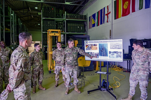 U.S. Air Force Staff Sgt. Richard Bure, 1st Communications Maintenance Squadron logistics supervisor, outlines the 1st CMXS’s mission to U.S. Air Force Maj. Gen. Trent C. Davis, left, Headquarters U.S. Air Force chief of chaplains, at Ramstein Air Base, Germany, Jan. 24, 2025. The 1st CMXS ensures resilient, sustainable, agile and responsive communications demands are met quickly and available across the U.S. Air Forces in Europe and Air Forces Africa. (U.S. Air Force photo by Senior Airman Brenden Beezley)