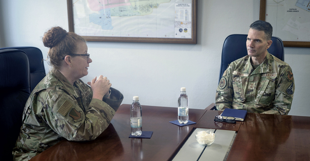 U.S. Air Force Brig. Gen. Adrienne L. Williams, 86th Airlift Wing commander, speaks with Maj. Gen. Trent C. Davis, Headquarters U.S. Air Force chief of chaplains, at Ramstein Air Base, Germany, Jan. 24, 2025. As Chief of Chaplains, Davis is the senior pastor for more than 700,000 active duty, guard, reserve and civilian forces serving in the U.S. and overseas. (U.S. Air Force photo by Senior Airman Olivia Sampson)