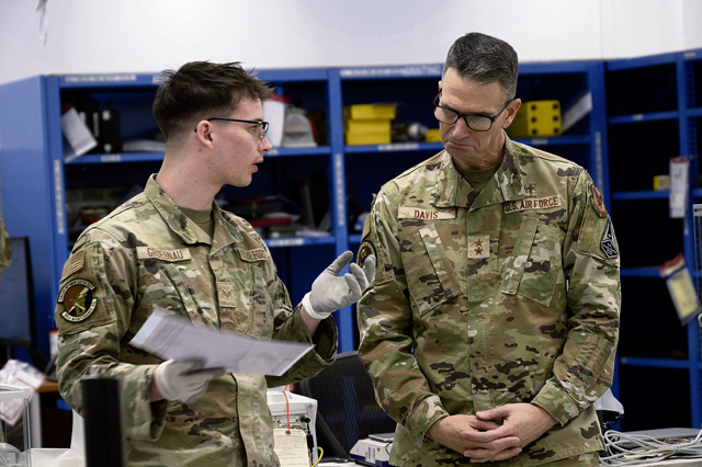 U.S. Air Force Senior Airman Matthew Gruebnau, 86th Maintenance Squadron physical/dimensional technician, explains his daily duties to Maj. Gen. Trent C. Davis, Headquarters U.S. Air Force chief of chaplains, at Ramstein Air Base, Germany, Jan. 24, 2025. As a member of the Chief of Staff of the Air Force and Chief of Space Operations special staff, Davis establishes guidance and provides advice on all matters pertaining to the religious and moral welfare of Air Force and Space Force personnel. (U.S. Air Force photo by Senior Airman Olivia Sampson)