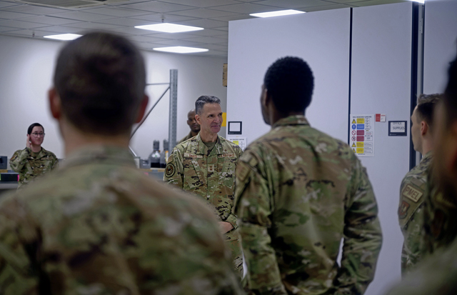 U.S. Air Force Maj. Gen. Trent C. Davis, Headquarters U.S. Air Force chief of chaplains, speaks to members of the 86th Mechanical Squadron at Ramstein Air Base, Germany, Jan. 24, 2025. The MXS accomplishes all aspects of aircraft and equipment maintenance to fulfill the wing’s airlift, contingency and support missions. (U.S. Air Force photo by Senior Airman Olivia Sampson)