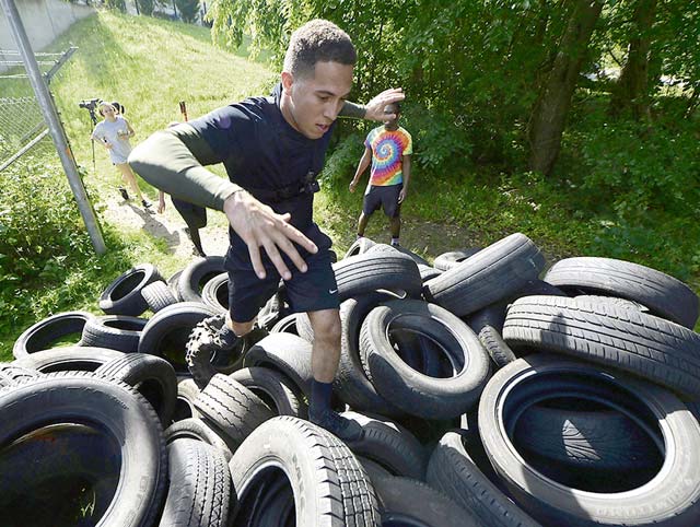 Senior Airman Corinthian Maldonado, 86th Airlift Wing commander executive administrator, climbs a hill of tires at the Mudless Mudder July 8, 2016 on Ramstein. Physical activity can help prevent disease and injury. Social fitness is important for healthy aging. — Photo by Senior Airman Nesha Humes