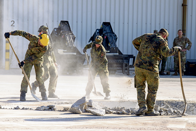 German air force members sweep debris into simulated airfield damage during an airfield repair demonstration at Ramstein Air Base, Aug. 23. The demonstration consisted of repairing a 20-foot-wide crater using precast concrete slabs with just 20 personnel.