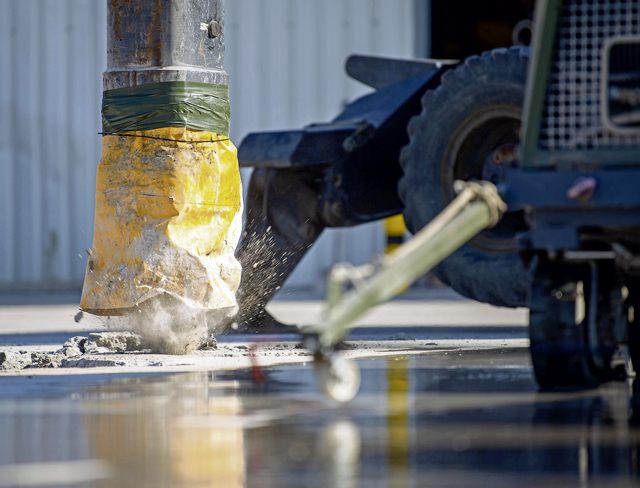 U.S. Air Force Airmen assigned to the 86th Civil Engineer Squadron and German air force members use heavy equipment to break apart concrete at the site of simulated airfield damage during an airfield repair demonstration at Ramstein Air Base, Aug. 23. Teams from Headquarters U.S. Air Forces in Europe – Air Forces Africa, NATO Allied Air Command, Air Force Civil Engineer Center, 86th Civil Engineer Group, the Military Engineering Centre of Excellence, German air force and Italian army attended the demonstration to observe and gather data toward further integrating and strengthening partnerships between NATO allies and partners.