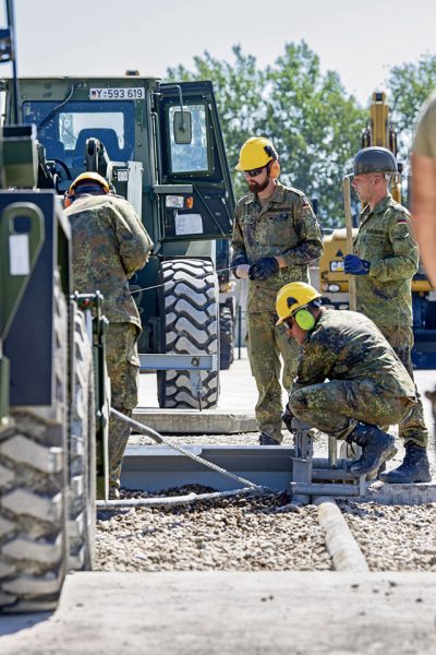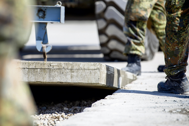 (Left) German air force members put a slab of precast concrete down to temporarily repair simulated damage to an airfield at Ramstein Air Base, Aug. 24. Headquarters U.S. Air Forces in Europe – Air Forces Africa plans to continue hosting these engagements in the future and to further integrate NATO allies and partners into training with the U.S., ultimately strengthening the relationships between NATO allied countries.