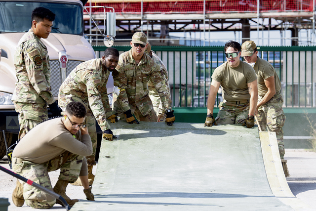 U.S. Air Force Airmen assigned to the 86th Civil Engineer Group put sheets of fiber reinforced polymer together to temporarily repair simulated damage during an airfield repair demonstration at Ramstein Air Base, Aug. 24. The 86th CEG repaired a 30-foot-wide crater using fiber-reinforced polymer mats, nine vehicles, 18 pieces of equipment and only 14 personnel instead of repairing the damage with a standard Rapid Airfield Damage Repair kit. Photos by Airman 1st Class Regan Spinner