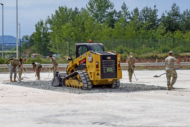 Members of the German air force flatten crushed rocks to fill a crater during an airfield repair demonstration at Ramstein Air Base, Aug. 24. The collaboration between the German air force and Airmen assigned to the 86th Civil Engineer Group during this demonstration fostered trust, promoted shared knowledge, and reinforced the ability to operate seamlessly in multinational environments, ultimately contributing to regional and global stability.