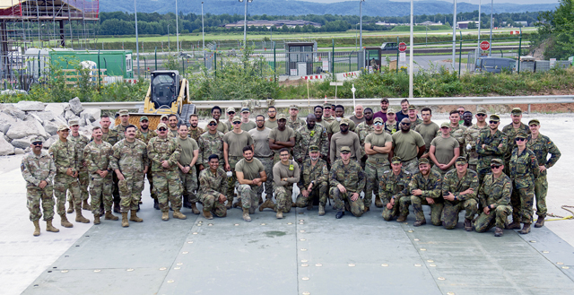 German air force members and U.S. Air Force Airmen assigned to the 86th Civil Engineer Group stand together after a two-day airfield repair demonstration at Ramstein Air Base, Aug 24. This demonstration was held with the intent to enhance interoperability, strengthen strategic partnerships, and improve the overall effectiveness of both the German air force and the 86th CEG airfield repair capabilities. Photo by Airman 1st Class Regan Spinner