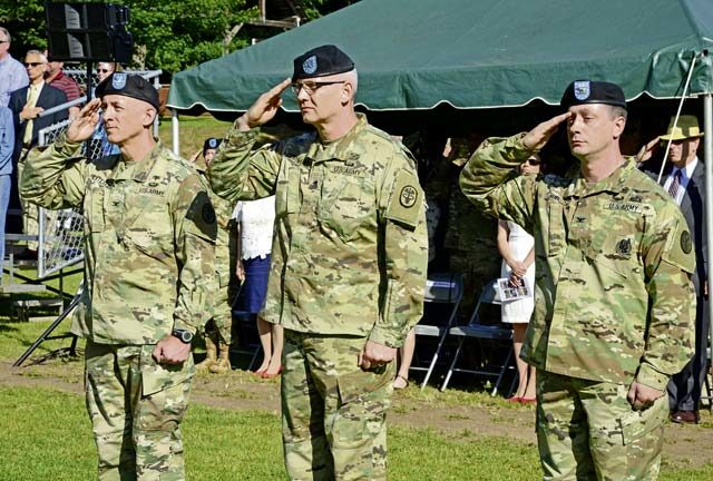 Landstuhl Regional Medical Center outgoing Commander Col. James Laterza, Regional Health Command Europe Commanding General Brig. Gen. Dennis P. LeMaster and incoming LRMC Commander Col. Timothy Hudson salute to honor the German and American national anthems during the LRMC Change of Command Ceremony June 13 in Landstuhl. — Photos by Liz Paque