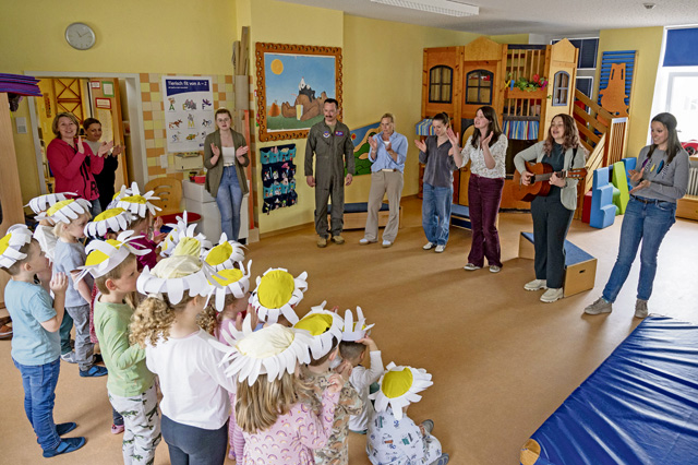 Later, Maj. Gen. Moga visited Villa Winzig, a local German kindergarten, where he met with Ms. Susanne Christmann, Director of Villa Winzig, and Ms. Caroline Moor, the kindergarten’s English language teacher. Maj. Gen. Moga read to the children and enjoyed a song performed by the class as part of the 86th Airlift Wing’s Grassroots community outreach program that began in 2009 at Villa Winzig and has expanded to two additional kindergartens. In this program, children are offered a unique English language curriculum and paid regular visits by U.S. military volunteers.