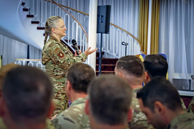 U.S. Air Force Chief Master Sgt. Stephanie Cates, command chief of the 3rd Air Force, speaks to class 23-6 as they graduate from the Kisling Non-Commissioned Officer Academy during a ceremony at the Armstrong Club, Vogelweh Military Complex, Kaiserslautern, Germany on September 20, 2023. Cates was at the ceremony as the honorary guest speaker. Kisling NCOA’s mission is to educate and develop enlisted warfighters to lead teams in joint multi-domain environments. (U.S. Army photo by Spc. Samuel Signor)