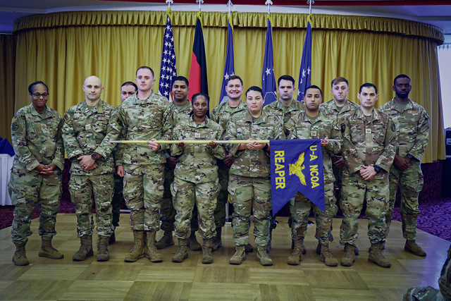 U.S. Air Force Airmen and an Army Soldier from Class 23-6’s “Reaper Flight” pose for a photo with Chief Master Sgt. Tyhae Willocks, commandant of the Kisling Non-Commissioned Officer Academy, during their class graduation ceremony at the Armstrong Club, Vogelweh Military Complex, Kaiserslautern, Germany on September 20, 2023. Kisling NCOA prides itself on teaching service members their warrior ethos and paving way for their students to not only become better Soldiers, Airmen, Sailors, Marines, or Guardians, but to become better humans to lead their subordinates. (U.S. Army photo by Spc. Samuel Signor)
