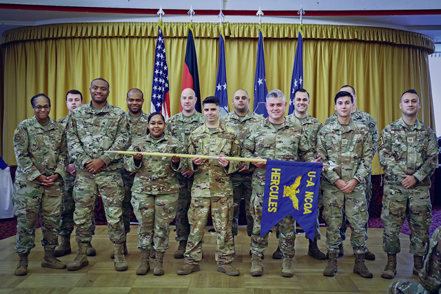U.S. Air Force Airmen and an Army Soldier from Class 23-6’s “Hercules Flight” pose for a photo with Chief Master Sgt. Tyhae Willocks, commandant of the Kisling Non-Commissioned Officer Academy, during their class graduation ceremony at the Armstrong Club, Vogelweh Military Complex, Kaiserslautern, Germany on September 20, 2023. Kisling NCOA is the NCO Academy on Kapaun Air Station that hosts class for Service Members across Europe and Africa. ( Army photo by Spc. Samuel Signor)