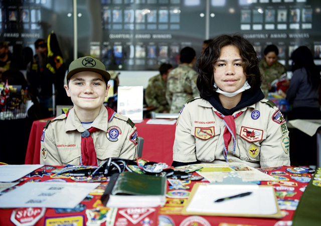 Boy Scouts of America troops sit at their booth during the Kaiserslautern Military Community In Da Club event held at Ramstein Air Base, Germany, Nov. 4, 2022. The event offered military members, civilians and families of the KMC an opportunity to see the groups and clubs offered here. (U.S. Air Force photo by Staff Sgt. Gabrielle Spalding)