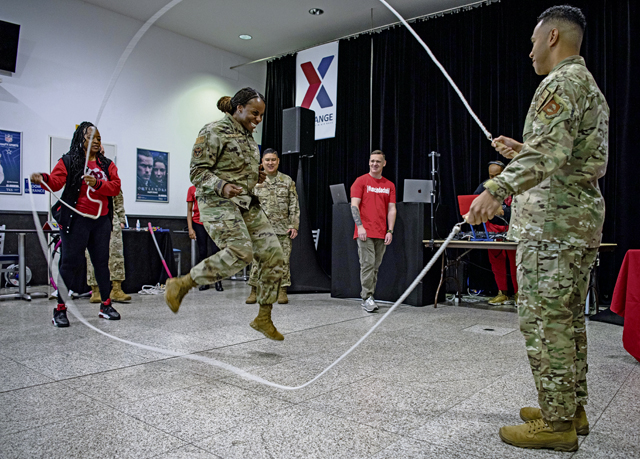 Team Ramstein members participate in double dutch during the Kaiserslautern Military Community In Da Club event held at Ramstein Air Base, Germany, Nov. 4, 2022. Attendees were able to interact with over 40 clubs offered in the KMC area. (U.S. Air Force photo by Staff Sgt. Gabrielle Spalding)