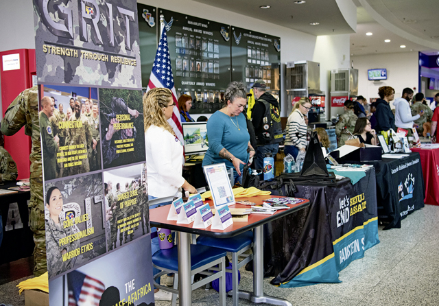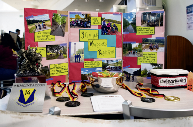 Information about Stroller Warriors Ramstein is displayed during the Kaiserslautern Military Community In Da Club event held at Ramstein Air Base, Germany, Nov. 4, 2022. The event offered military members, civilians and families of the KMC an opportunity to see over 40 groups and clubs offered here. (U.S. Air Force photo by Staff Sgt. Gabrielle Spalding)