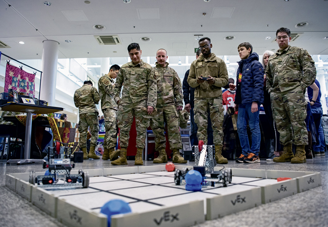 U.S. Military members and civilians watch a robotics competition, which was set up by the Hercules Innovation Lab, during the Kaiserslautern Military Community In Da Club event held at Ramstein Air Base, Germany, Nov. 4, 2022. Over 40 clubs and groups in the KMC were on display to include a pin collecting club, quilting club and a hockey club. (U.S. Air Force photo by Staff Sgt. Gabrielle Spalding)