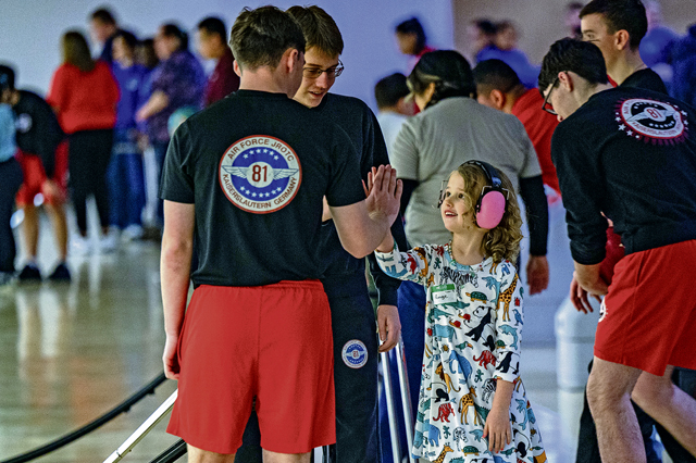 Junior Reserve Officers’ Training Corps cadets high five a participant during a Special Olympics tribute bowling event at Vogelweh Military Complex, Germany, Dec. 4, 2024. The event gave children with disabilities a safe and engaging environment to interact with members of the Kaiserslautern Military Community. (U.S. Air Force photo by Airman 1st Class Trevor Calvert)