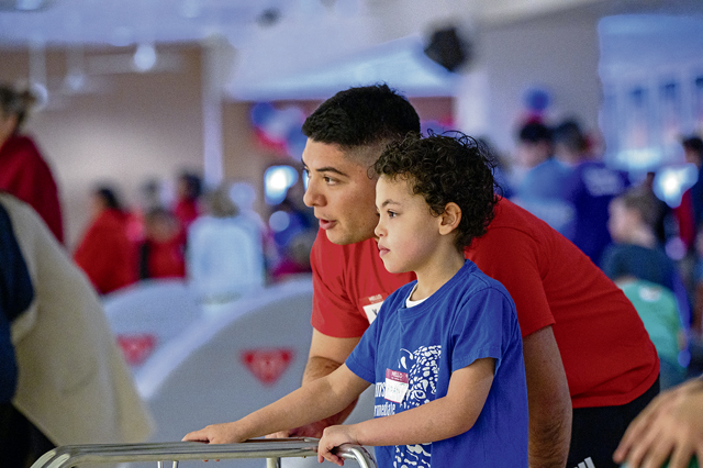U.S. Air Force Senior Airman Joseph Euler, 603rd Air Operations Center air tasking order production technician, helps a participant bowl during a Special Olympics tribute bowling event at Vogelweh Military Complex, Germany, Dec. 4, 2024. This event allowed service members and children with disabilities from across the Kaiserslautern Military Community a chance to interact with each other to build relationships. (U.S. Air Force photo by Airman 1st Class Trevor Calvert)