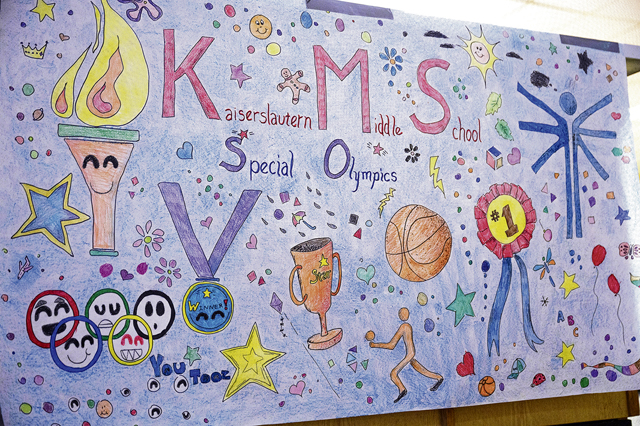 An event poster made by Kaiserslautern Middle School students hangs at Vogelweh Military Complex, Germany, Dec. 4, 2024. The poster, highlighted at a Special Olympics tribute bowling event, focused on building lasting relationships between the participants of the event and the community. (U.S. Air Force photo by Airman 1st Class Trevor Calvert)