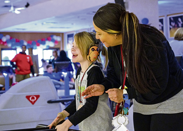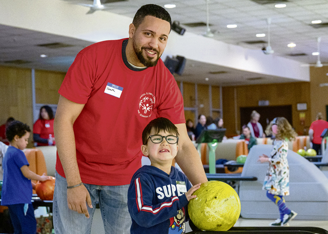 A Special Olympics tribute bowling event volunteer and participant celebrate at Vogelweh Military Complex, Germany, Dec. 4, 2024. The event gave children with disabilities a safe and engaging environment to interact with members of the Kaiserslautern Military Community. (U.S. Air Force photo by Airman 1st Class Trevor Calvert)