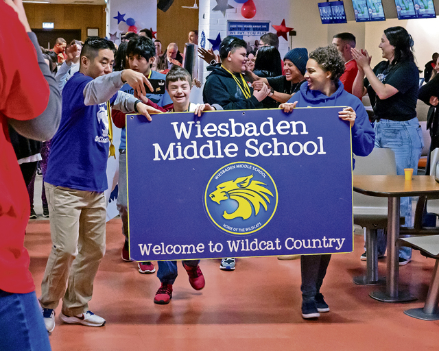 Students from Wiesbaden Middle School and other schools around the Kaiserslautern Military Community celebrate after a Special Olympics tribute bowling event at Vogelweh Military Complex, Germany, Dec. 4, 2024. Children with disabilities from across the KMC participated in the event, allowing the children to interact with Junior Reserve Officers’ Training corps cadets, teachers and service members from around the community. (U.S. Air Force photo by Airman 1st Class Trevor Calvert)