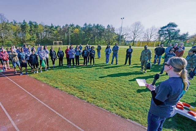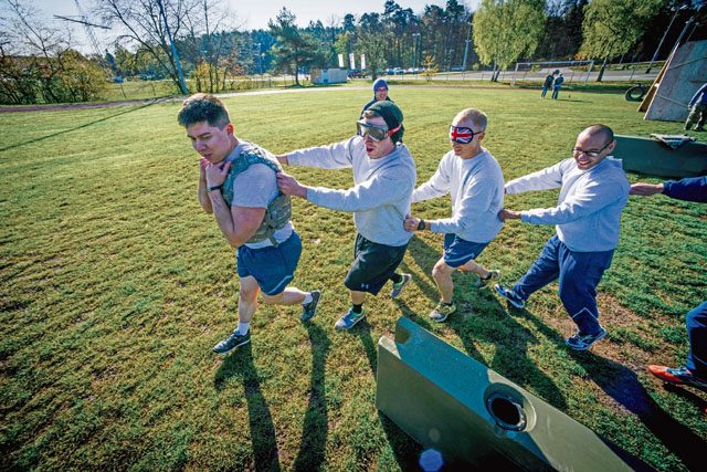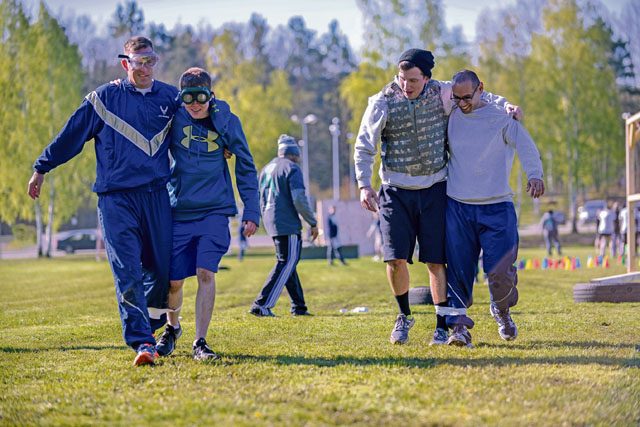 Airmen participating in the Courage, Leadership, Education, Advocate and Respect course run a three-legged race April 29 on Vogelweh. During the obstacle course, Airmen and Soldiers from the KMC had the chance to wear “drunk goggles” to simulate the feeling of functioning under the influence of alcohol.