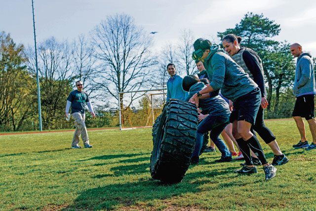 A team of Soldiers flip a tire during the Courage, Leadership, Education, Advocate and Respect course April 29 on Vogelweh.