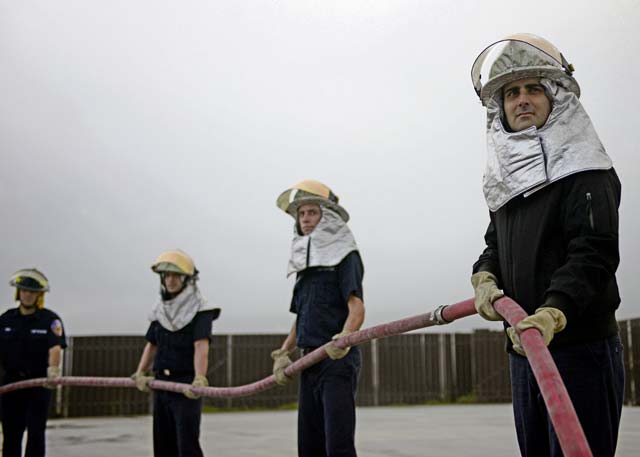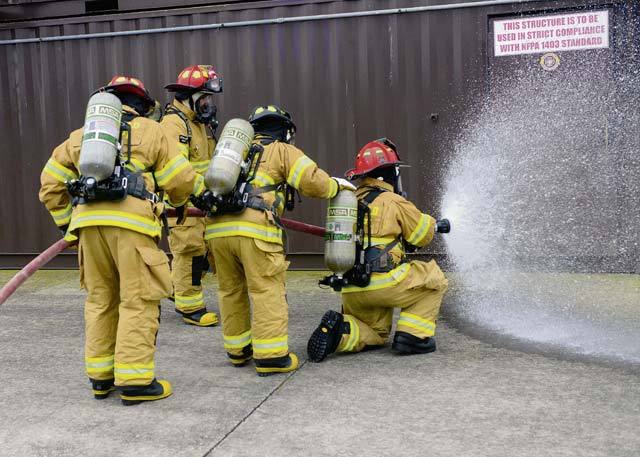 Newly recruited firefighters from the 65th Civil Engineer Squadron support a fire hose for their classmates while they combat a structural fire at their training facility Feb. 6 on Lajes Field, Azores, Portugal.