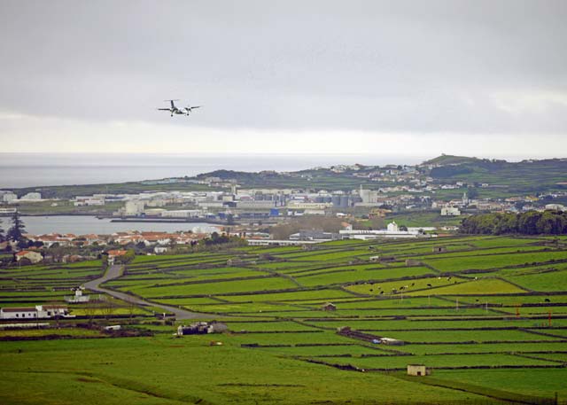 A commercial aircraft lands Feb. 7 on Lajes Field, Azores, Portugal. The flightline at Lajes Field is operated by the 65th Air Base Group and shared by the local airport for all passengers coming to the island.
