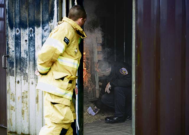 Firefighters from the 65th Civil Engineer Squadron start a structural fire at their training facility Feb. 6 on Lajes Field, Azores, Portugal. The training was designed to prepare newly hired Portuguese locals.