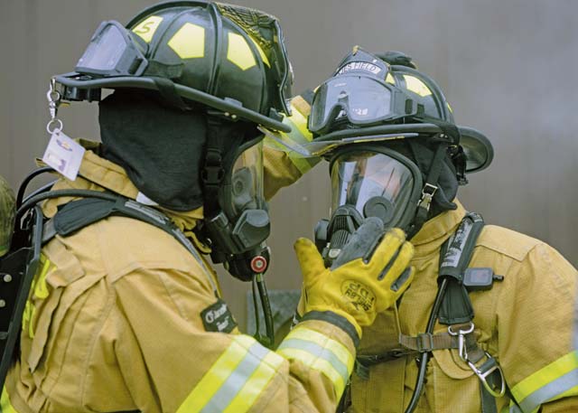 Firefighters from the 65th Civil Engineer Squadron test the seal of their oxygen masks before combatting a structural fire at their training facility Feb. 6 on Lajes Field, Azores, Portugal.