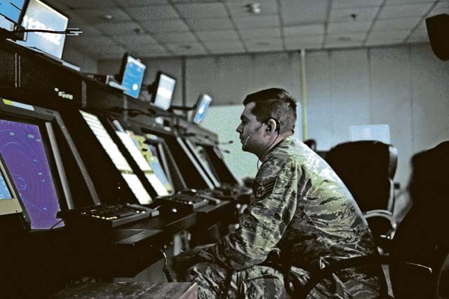 Staff Sgt. Brandon Bantau, 65th Operations Support Squadron air traffic control watch supervisor, monitors a radar approach control screen for incoming aircraft Feb. 7 on Lajes Field, Azores, Portugal.