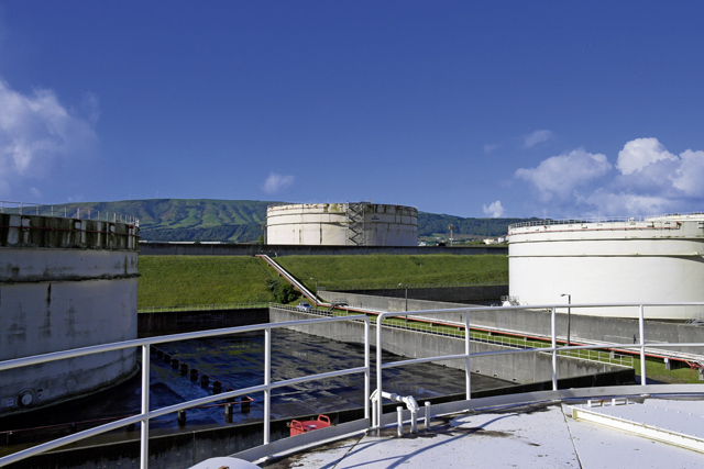 Large fuel tanks, capable of holding 38 million gallons of fuel, can be seen at Lajes Field, Portugal, Oct. 18, 2022. Due to the location of Lajes Field, the base is a mission critical refueling point for aircraft crossing the mid-Atlantic Gap. (U.S. Air Force photo by Airman 1st Class Lauren Jacoby)