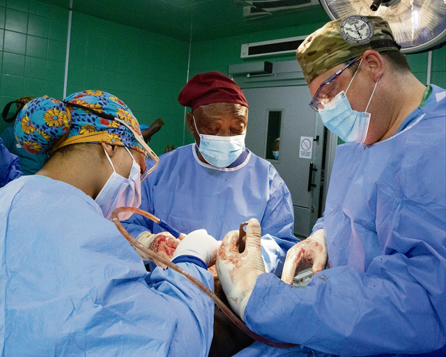 18 oral and maxillofacial, 120 dental and 15 OB/GYN surgeries/procedures,” added Burnett. “Overall, our team treated approximately 950 patients. There was a wide variety of cases seen, including trauma, general surgery, dental (including oral maxillofacial surgery), internal medicine, OB/GYN, critical care (ICU), emergency room, anesthesia, wound care, etc. Additionally, our Army veterinary team completed more than 60 procedures involving military working dogs, family pets and farm animals.”