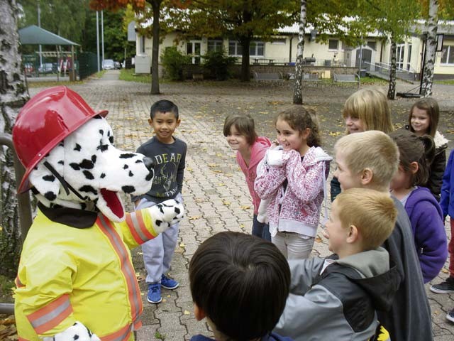 Firefighters Carsten Beberich, Patrick Stephan, Marcel Kolb and Sascha Dillinger visited Landstuhl Elementary and Middle School recently to talk about fire safety. Students in Julie Wittenberg’s class were excited and captivated by Sparky the Fire Dog.