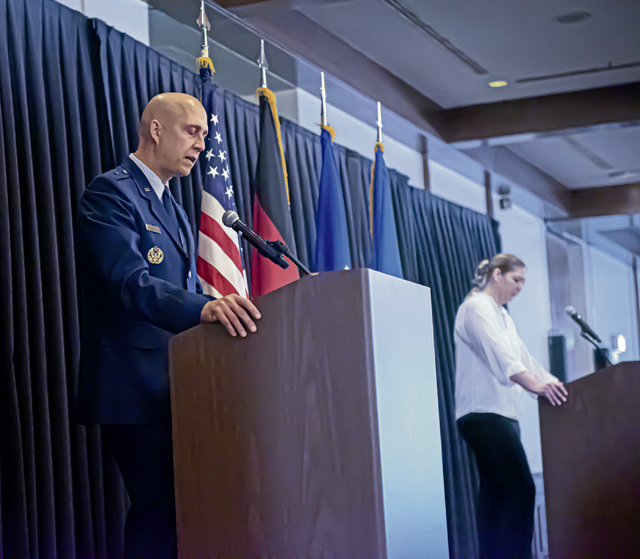 U.S. Air Force Brig. Gen. Josh Olson, 86th Airlift Wing commander, gives a speech congratulating honorees at a Length of Service ceremony at Ramstein Air Base, Germany, June 24, 2022. More than 60 U.S. and German civilian honorees received certificates for their dedication of service during the Length of Service ceremony. (U.S Air Force photo by Senior Airman Manuel G. Zamora)