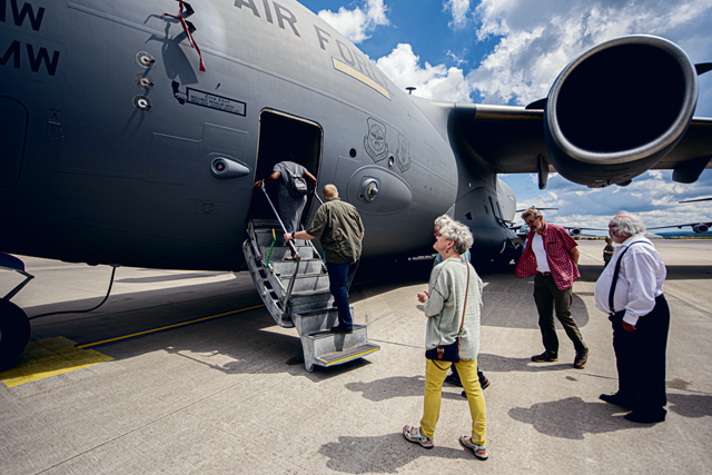 After a Length of Service ceremony, honorees and their families are given a tour inside a C-17 Globemaster III aircraft at Ramstein Air Base, Germany, June 24, 2022. Over 60 German and U.S honorees received recognition for their dedication of service during the ceremony. (U.S Air Force photo by Senior Airman Manuel G. Zamora)