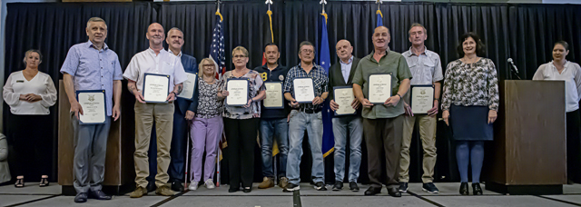 German and U.S civilian honorees with more than 40 years of service, pose for a photo at a Length of Service ceremony at Ramstein Air Base, Germany, June 24, 2022. More than 60 honorees whose length of service to the government ranged from 20 to 45 years attended the ceremony . (U.S Air Force photo by Senior Airman Manuel G. Zamora)