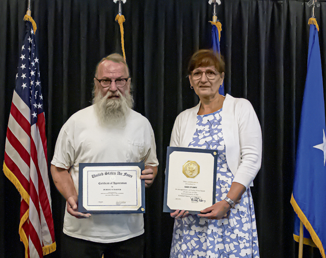 Hubert Schaefer and Gabi Stumpf pose for a photo at a Length of Service ceremony at Ramstein Air Base, Germany, June 24, 2022. The honorees were recognized for their 45 plus years of service to the U.S. government. (U.S Air Force photo by Senior Airman Manuel G. Zamora)