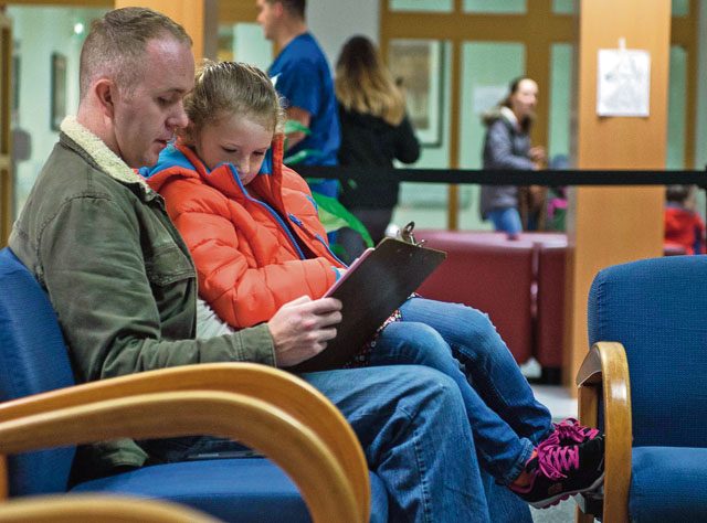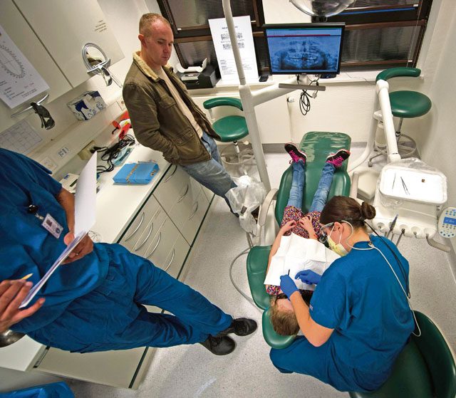Ben LeNeave and his daughter, Emma, fill out a pre-appointment form during the 86th Dental Squadron’s “Little Teeth, Big Smiles” event Nov. 5 on Ramstein. The event was a way for children up to 10 years old to get their teeth checked or cleaned in an environment tailored to their age group. According to the Center for Disease and Control, tooth decay is one of the most common chronic conditions of childhood in the United States. Untreated cavities can cause pain and infections that may lead to problems with eating, speaking, playing and learning.