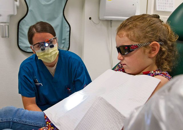 Emma LeNeave gets her teeth cleaned by Capt. Heather Rybar, 86th Dental Squadron general dentist, during the “Little Teeth, Big Smiles” event Nov. 5 on Ramstein.