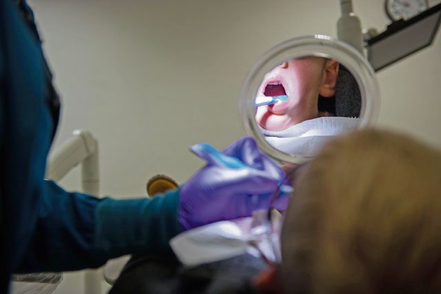 Channing Wray, holds a mirror to watch as his dentist cleans his teeth during the “Little Teeth, Big Smiles” event Nov. 5 on Ramstein.