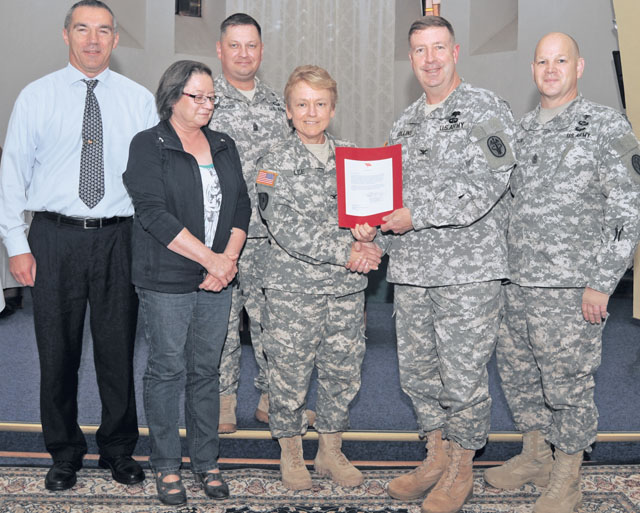 From left, Harry Raith, Henny Moll, Command Sgt. Maj. Timothy Sprunger, Col. Judith Lee, Col. John Collins and Sgt. Major Brian Stauffer receive the MEDCOM Exceptional Organizational Safety Award.