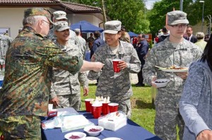 Lines of service members, families and community members stood in line to pile their plates high with goulash and noodles, assorted salads and German pastries prepared by members of a German army reserve unit. Guests also