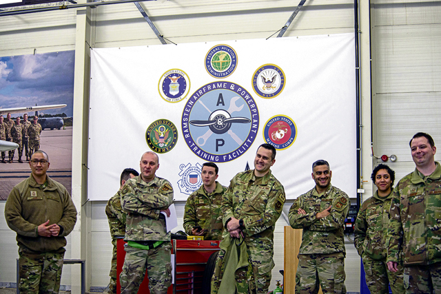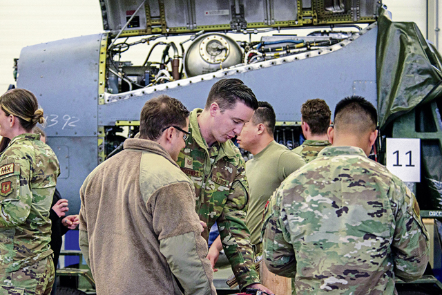 U.S. Air Force Airmen assigned to the 86th Aircraft Maintenance Squadron wait for a maintenance competition qualifier to begin March 6, 2023, at Ramstein Air Base, Germany. Out of the Airmen participating, five will be selected, along with two alternates, to join a team that will compete in the national Aerospace Maintenance Competition, held by the Aerospace Maintenance Council in Atlanta, Georgia. (U.S. Air Force photo by Airman 1st Class Regan Spinner)