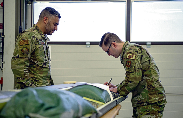 A U.S. Air Force Airman from the 86th Aircraft Maintenance Squadron rates the performance of a maintainer participating in a maintenance competition qualifying event at Ramstein Air Base, Germany, March 6, 2023. The competition, held by the 86th AMXS, gave participants 15 minutes to complete an aircraft maintenance event to try and qualify for the team that will compete next month at the national Aerospace Maintenance Competition. (U.S. Air Force Photo by Airman 1st Class Regan Spinner)