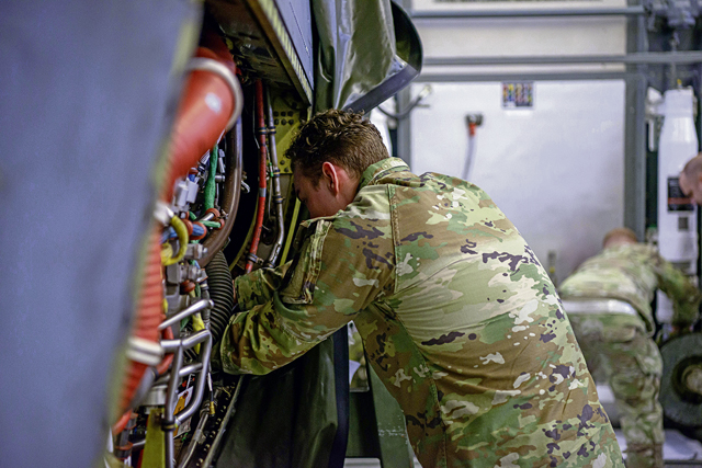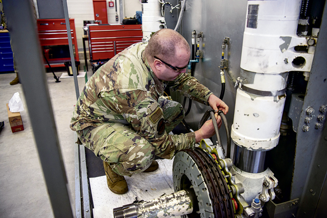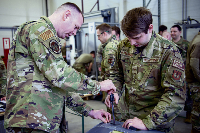 A U.S. Air Force Airman assigned to the 86th Aircraft Maintenance Squadron, removes and reinstalls a hydraulic line during a maintenance competition qualifier event March 6, 2023 at Ramstein Air Base, Germany. The opportunity to participate in the national Aircraft Maintenance Competition provides the Airmen selected an opportunity to learn new skills within the maintenance field and make connections with other maintainers across the Air Force. (U.S. Air Force photo by Airman 1st Class Regan Spinner)