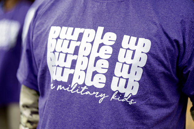A member of the Kaiserslautern Military Community greets children during Purple Up! Day at Ramstein Air Base, Germany, April 17, 2024. Purple Up! Day is an annual Department of Defense Education Activity designed to highlight the importance of providing children with quality services and support—helping them succeed in the mobile military lifestyle. (U.S. Air Force photo by Senior Airman Jordan Lazaro)