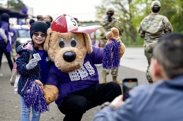 A father takes a picture of their child during the Purple Up! Day at Ramstein Air Base, Germany, April 17, 2024. Purple Up! Day is an annual Department of Defense Education Activity designed to highlight the importance of providing children with quality services and support—helping them succeed in the mobile military lifestyle. (U.S. Air Force photo by Senior Airman Jordan Lazaro)